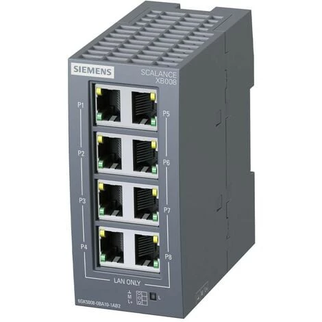 Commutateur Siemens SCALANCE XB008 pour 10/100 Mbit/s pour la configuration de petites structures en étoile et linéaires, avec les caractéristiques suivantes :