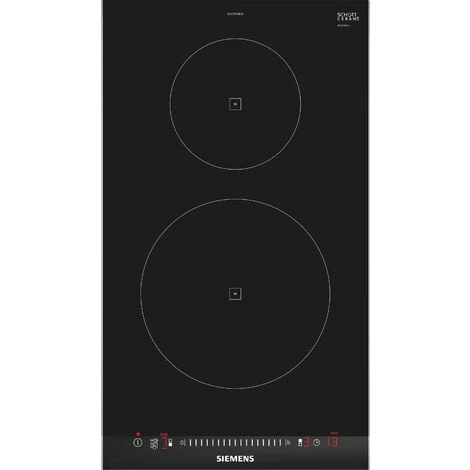 Table de cuisson Siemens EH375FBB1E.Ce Domino radiant rend la cuisine et le nettoyage plus facile.D’une largeur de 30 cm, il se combine très bien avec d’autres dominos.Fonction timer : la zone de cuisson se coupe une fois que le temps sélectionné arrive à échéance.Affichage digitalBandeau touchSlider.2 foyers inductionZones de cuisson : 1 x 145 mm, 1.4 kW (PowerBoost 2.2 kW), 1 x 210 mm, 2.2 kW (PowerBoost 3.7 kW).Fonction QuickStart : détection automatique des récipients sur la zone de cuissonFonction Re-Start : en cas d’arrêt brutal de la table, mémorisation de la température initiale pendant 4 secondesAffichage de la consommation énergétique17 positions de réglageTimer sur chaque foyerTémoin de chaleur résiduelle à 2 niveauxTouche nettoyage : possibilité de bloquer le bandeau de commande pendant 20 secondes afin de nettoyer la table en cas de débordement.