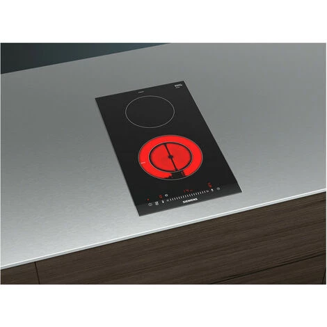 Table de cuisson SIEMENS ET375FFP1E.Le domino vitrocéramique pour cuisiner en toute sérénité et nettoyer en toute simplicité.Le domino de 30 cm de large est idéal pour personnaliser son plan de travail en l’associant à un autre domino ou une table classique avec profil inox sur les côtés.Grâce au touchSlider, la température peut être activée et contrôlée directement d’une simple pression ou d’un glissement du doigt.Grâce à la minuterie avec coupure automatique, la zone de cuisson se coupe automatiquement lorsque le temps de cuisson est écoulé.Design :Affichage digitalCommande touchSliderPuissance :2 zones highSpeed dont 1 foyer halogèneAvant 120 mm, 180 mm : 1 kW, 2 kWArrière 145 mm : Foyer normal 1.2 kW.Confort/Sécurité :Fonction Re-Start : en cas d’arrêt brutal de la table, mémorisation de la température initiale pendant 4 secondesAffichage de la consommation énergétique17 positions de réglageFonction powerBoostTimer sur chaque foyerTémoin de chaleur résiduelle à 2 niveauxTouche nettoyage : possibilité de bloquer le bandeau de commande pendant 20 secondes afin de nettoyer la table en cas de débordement