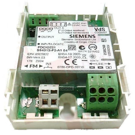 Module Siemens 1 entrée 1 sortie Iindirizzato FDCIO221, Pour le raccordement de 1 contact, ouvert ou fermé, indépendant, libre de potentiel pour la reconnaissance de membre de la technique (par exemple, le contrôle des ports ou de ventilation) ou suite à des alarmes (incendie sprinkler). 1 sortie pour le contrôle décentralisé de portes tglf, de ventilation, de climatisation, etc. Caractéristiques voir ci-dessous.