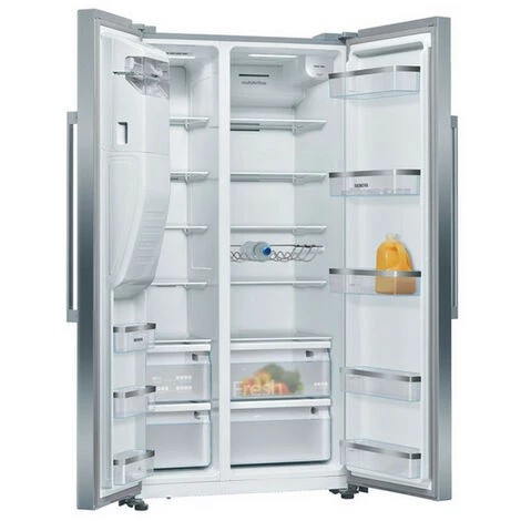 RĂ©frigĂ©rateur amĂ©ricain iQ500 Side by Side Siemens KA93DAIEP avec portes en acier inoxydable anti-traces. Technologie NoFrost : empĂŞche la formation de givre, rendant inutile le dĂ©givrage manuel du congĂ©lateur. Distributeur d’eau et de glaçons avec raccordement au secteur – pour glaçons et eau fraĂ®che.