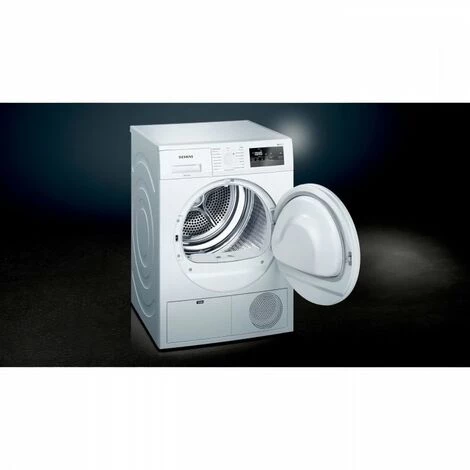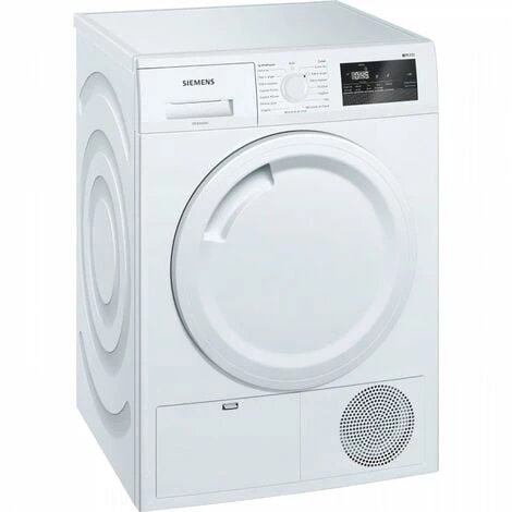 Seche-linge a condensation SIEMENS WT43N207FF – 7kg – Moteur induction – Blanc – Niveau sonore: 65 dB (A) -Cycle anti-froissage 120 min – Technologie autoDry- Design antiVibration – Ecran LED pour temps restant et fin différée 24 h, déroulement du programme, fonctions spéciales