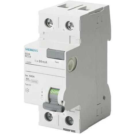 Interrupteur différentiel pur (disjoncteur) Siemens, 2 modules, prise DIN (universel pour tout types de central), 2P pôles, 25 ampères, courant différentiel Idn 300mA, tension 230 Vac, type différentiel AC.