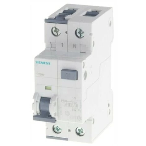 Disjoncteur magnétothermique différentiel Siemens, 2 modules, montage DIN (universel pour tout tableau du marché), pôles 1P+N, 10 ampères, pouvoir de coupure 4,5kA, tension 230/240 Vac, courant différentiel Idn 30mA, type AC, courbe de déclenchement C.
