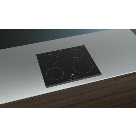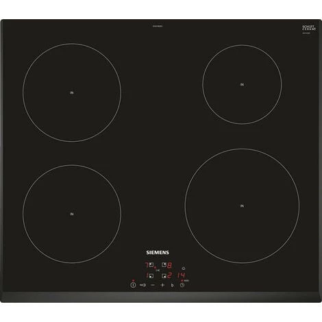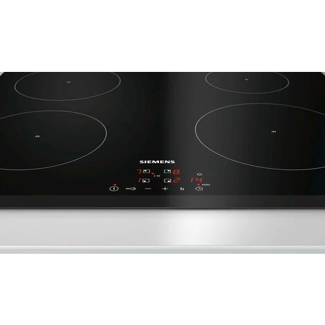 Table de cuisson Siemens EH651BEB1E est une table à induction avec de nouvelles fonctions innovantes, pour une grande flexibilité en toute situation.PowerBoost : jusqu’à 50 % de puissance supplémentaire pour des cuissons plus rapides.Design :Affichage digitalCommande touchControl (+/-)Puissance :4 foyers inductionZones de cuisson : 1 x Ø 180 mm, 1.8 kW (PowerBoost 3.1 kW), 1 x Ø 180 mm, 1.8 kW (PowerBoost 3.1 kW), 1 x Ø 145 mm, 1.4 kW (PowerBoost 2.2 kW),1 x Ø 210 mm, 2.2 kW (PowerBoost 3.7 kW)Confort/Sécurité :Fonction QuickStart : détection automatique des récipients sur la zone de cuisson.Fonction Re-Start : en cas d’arrêt brutal de la table, mémorisation de la température initiale pendant 4 secondes.17 positions de réglagePowerBoost sur chaque foyerTimer sur chaque foyerTémoin de chaleur résiduelle à 2 niveaux.Touche nettoyage : possibilité de bloquer le bandeau de commande pendant 20 secondes afin de nettoyer la table en cas de débordement.