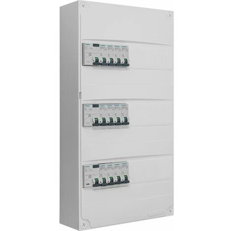 Description produit : Tableau électrique 3 rangées pré-équipé. Pour montage en GTL (gaine technique de logement) ou en saillie. Tableau électrique pré-équipé d’un interrupteur différentiel 30mA 40A type A + 2 interrupteurs différentiels 30mA 40A type AC + 3 disjoncteurs 10A + 5 disjoncteurs 16A + 3 disjoncteurs 20A + 1 disjoncteur 32A Indice de protection : IP30 Résistance aux chocs : IK05 Dimensions : hauteur : 475 mm Largeur : 250 mm Profondeur : 97 mm Composition du tableau prééquipé 3 rangées SIEMENS :